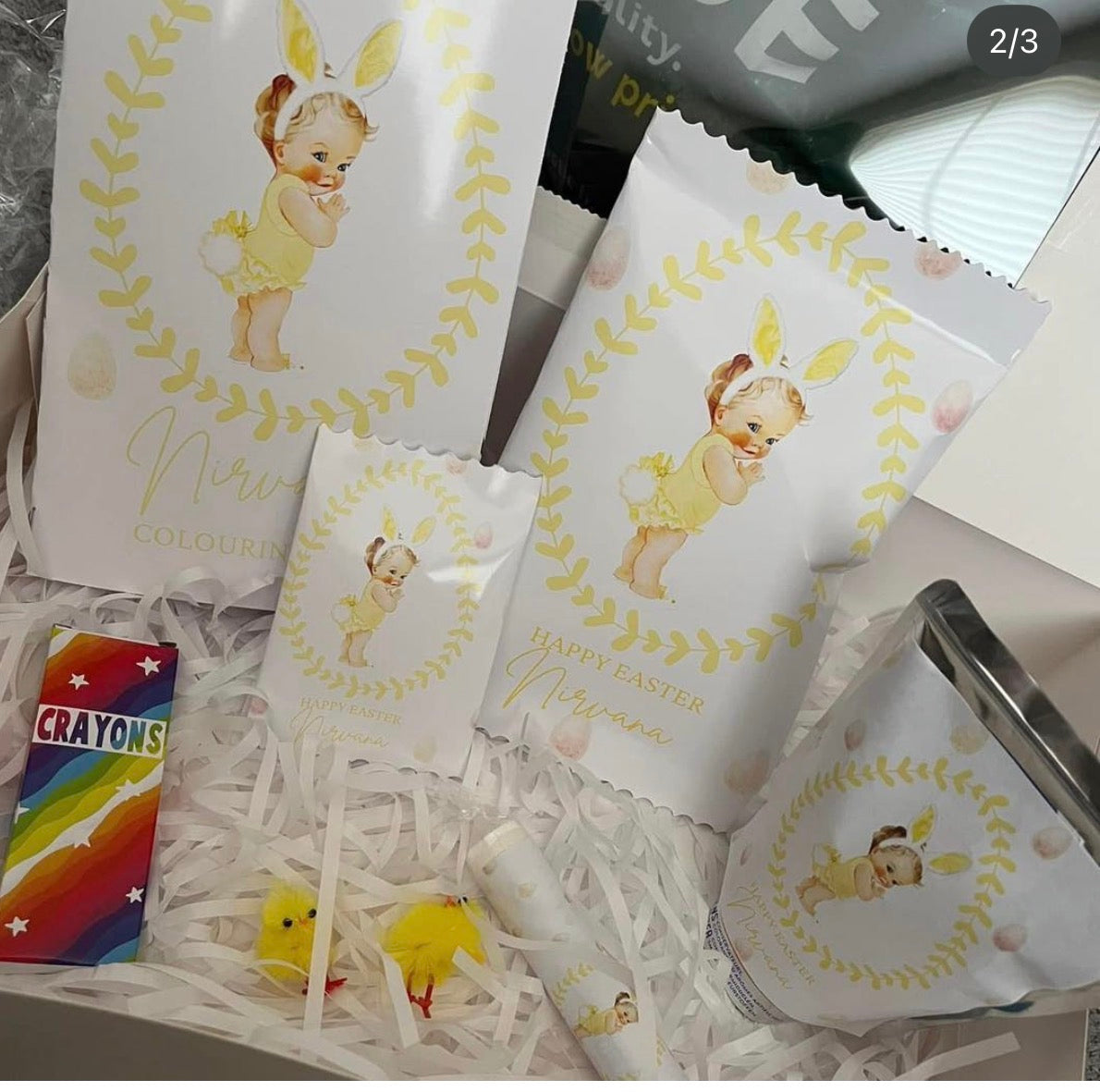 Comes with colouring book, crayons, love hearts, capri sun, crisps and mini haribos